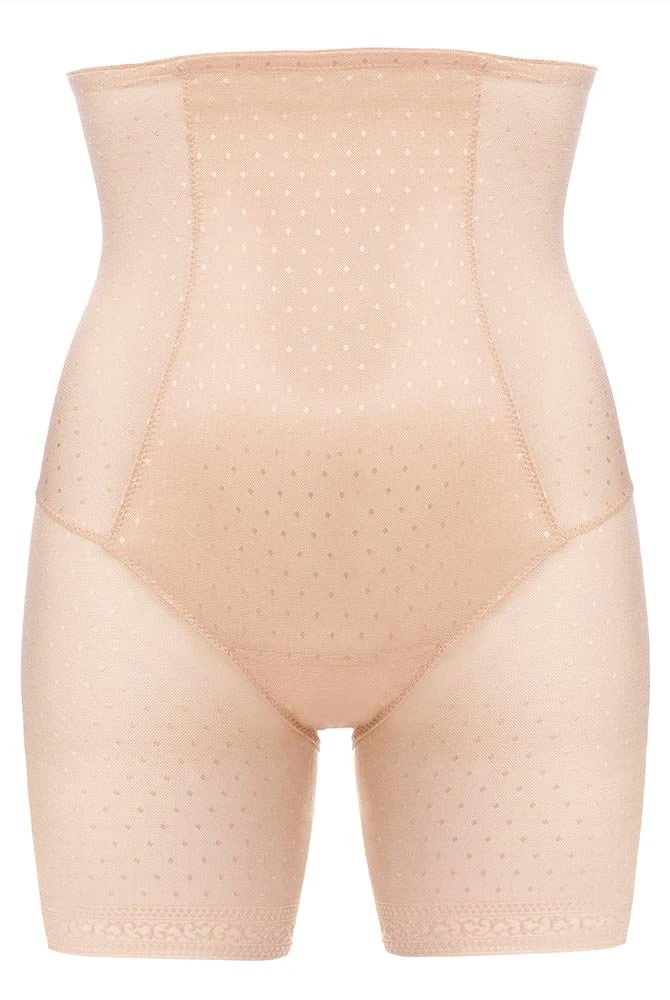 Der Stoff ist zart durchwebt von romantischen Punkten. Das Vorderteil ist doppelt mit Tüll unterlegt und verstärkt den Halt. Der Beinabschnitt reicht bis zur Mitte der Oberschenkel. Der Bund ist besonders hoch geschnitten und am oberen Abschluss mit silikonbeschichtetem Gummi verarbeitet, so dass nichts rutschen kann.